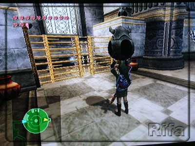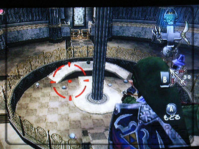 下にはポウフィー(ゴースト)がいる檻があった。檻の中のスイッチを押すと開くのだろうけど、どうやって押すんだろう…と思ってたので、もうひとつの置物を投げ入れちゃうよ!距離を確かめるため投げる練習をして、いざ!
